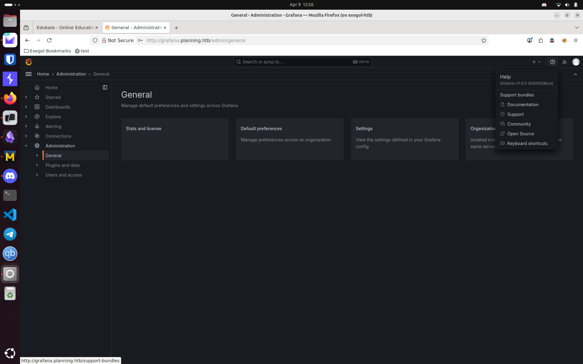 En haut à droite, sur le point d’interrogation, on retrouve qu’on utilise grafana 11.0