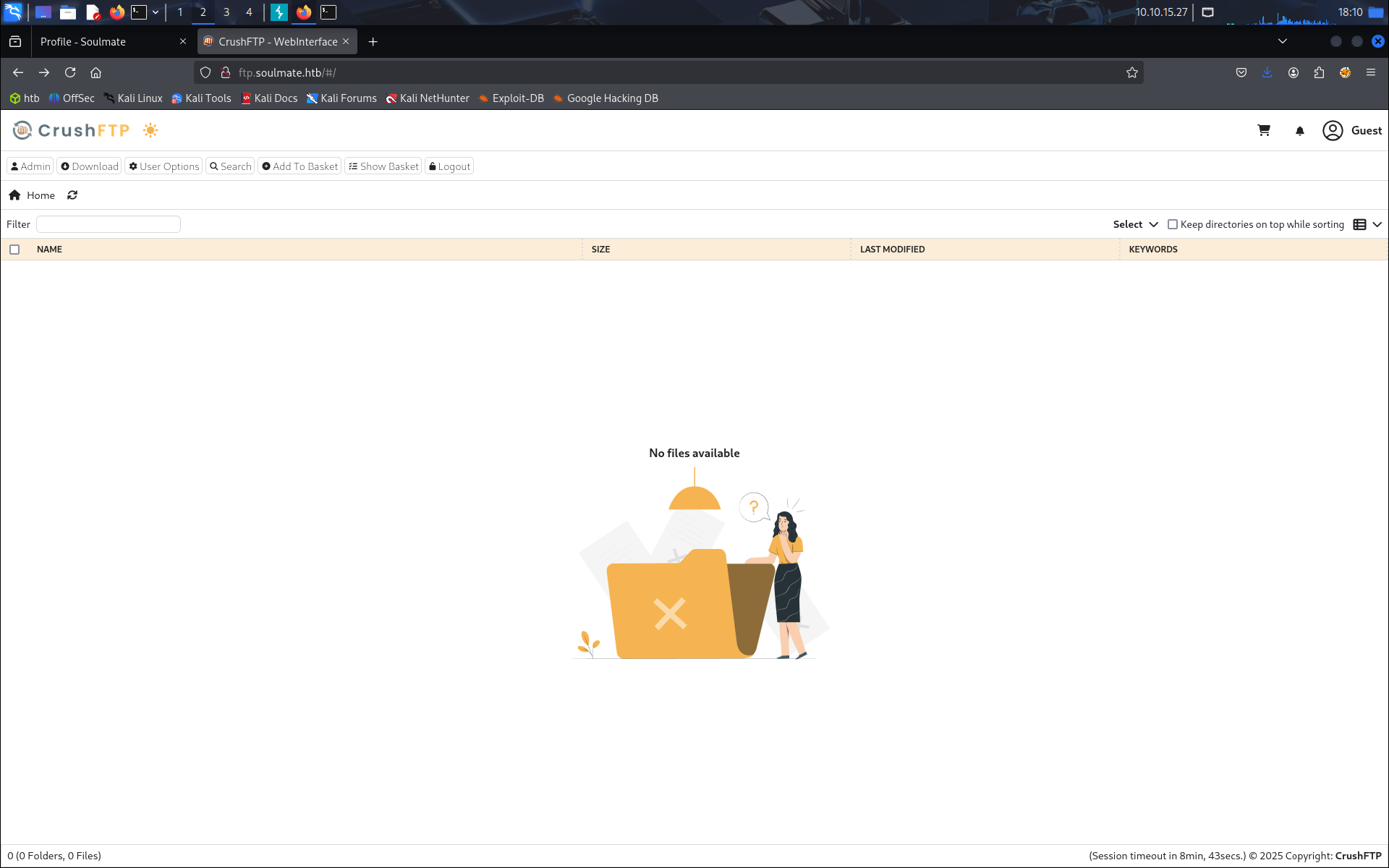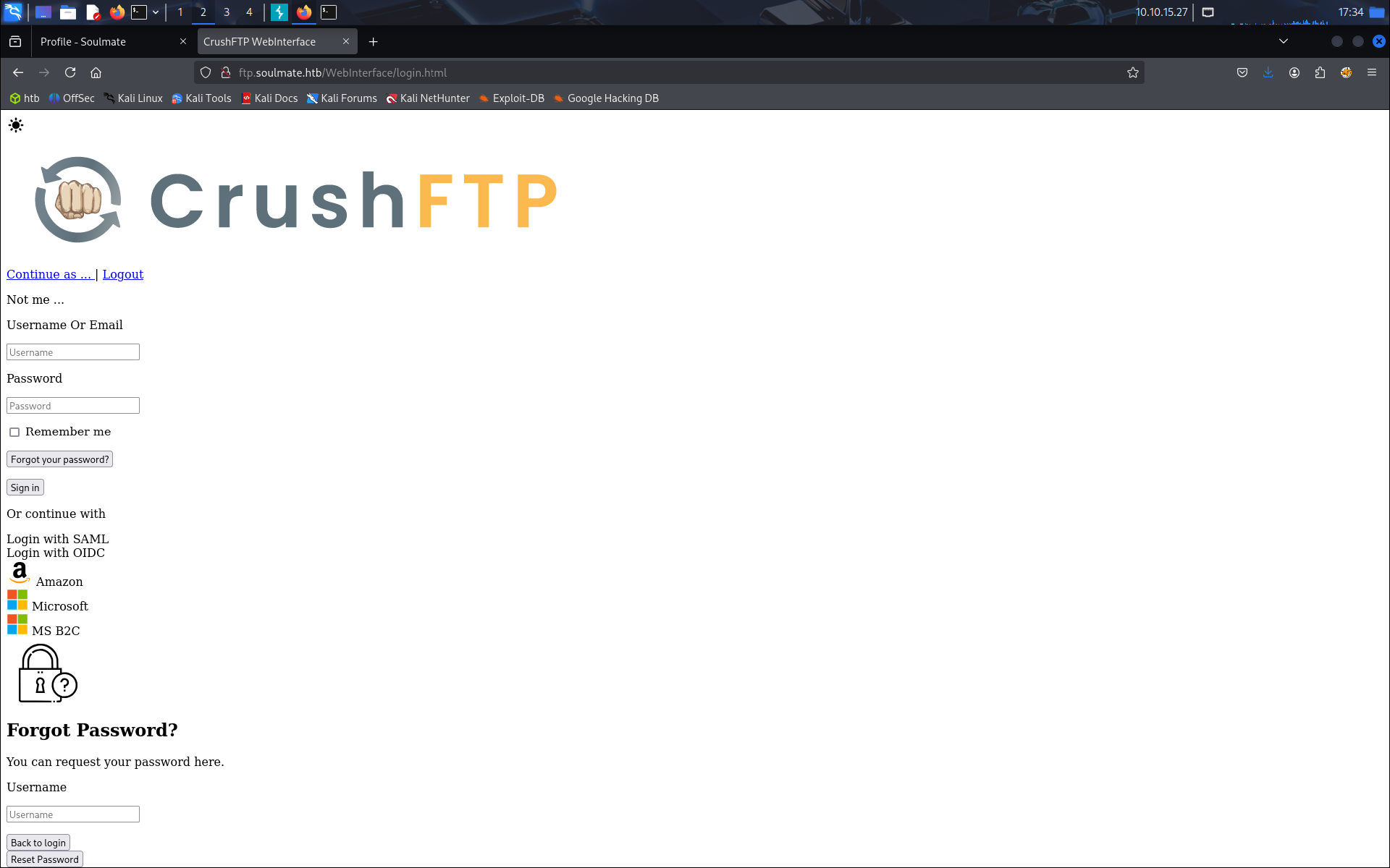 Après notre recherche de subdirs on en trouve un ftp.soulmate.htb. On l’ajoute dans notre /etc/hosts et on se connecte au site.
