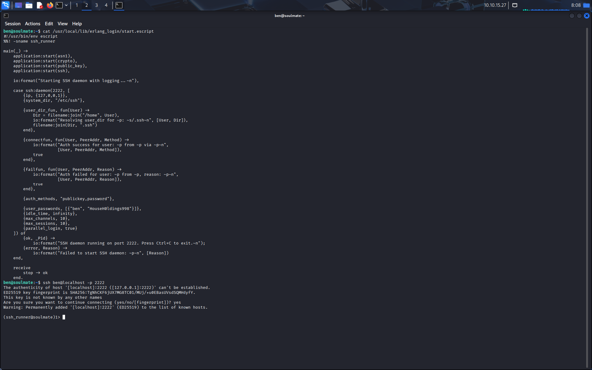 En faisant notre énumération, on a trouvé le script /usr/local/lib/erlang_login/start.escript dans lequel on trouve les identifiants de ben pour le ssh. Il se trouve que ce fichier nous indique aussi qu’un ssh erlang tourne sur le port 2222 et que l’on peut se connecter dessus avec les identifiants de ben. On se connecte alors avec