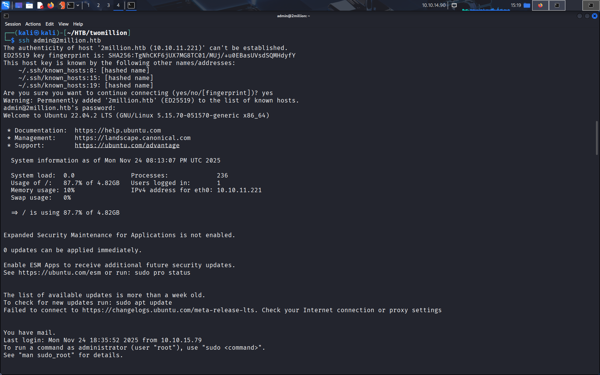 En fait pas besoin de se connecter à la db, on peut se connecter à l’utilisateur admin en ssh.